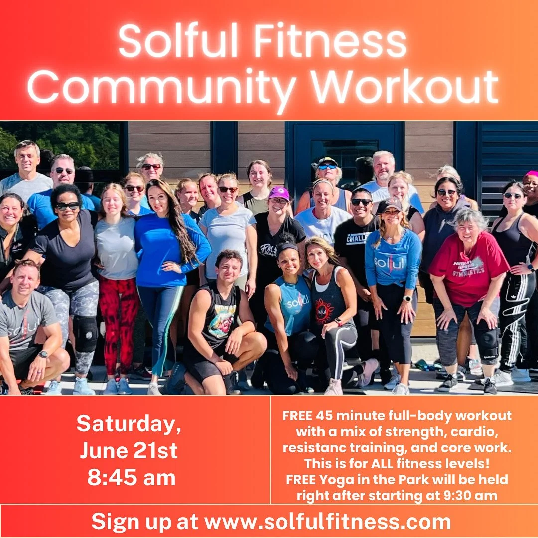 It's time for our Solful Fitness Community Workout πππ Join us for this FREE event, open to all! Share with friends, family, neighbors, and coworkers. Let's unite our community through fun fitnessπͺπΎ π§πΌββοΈ.